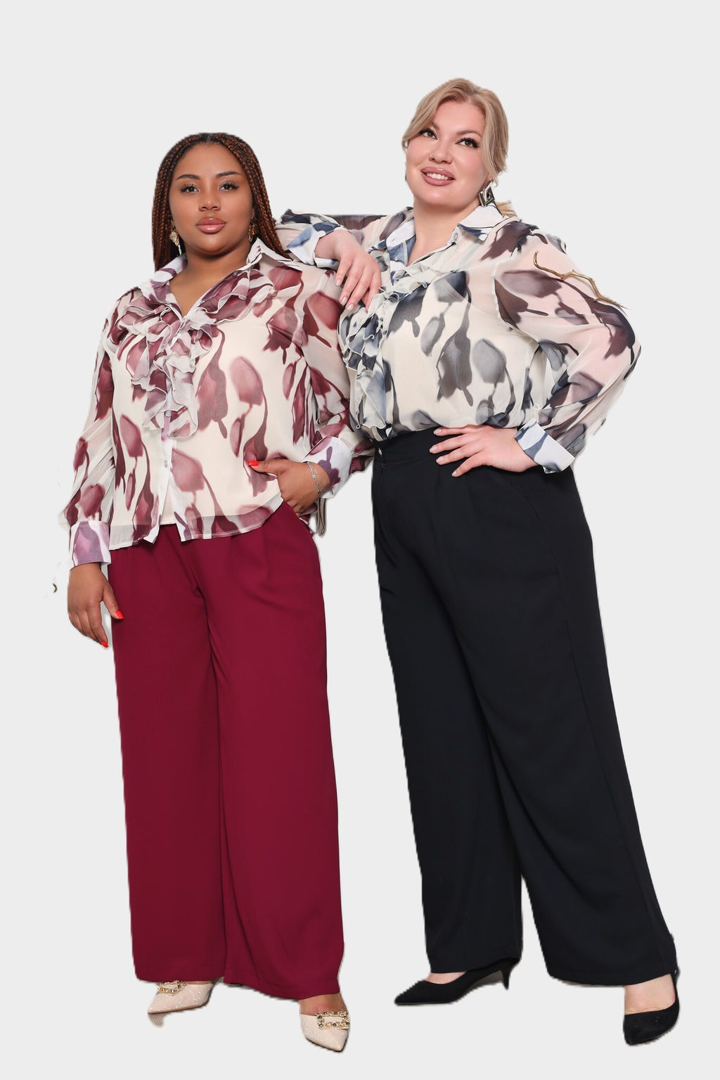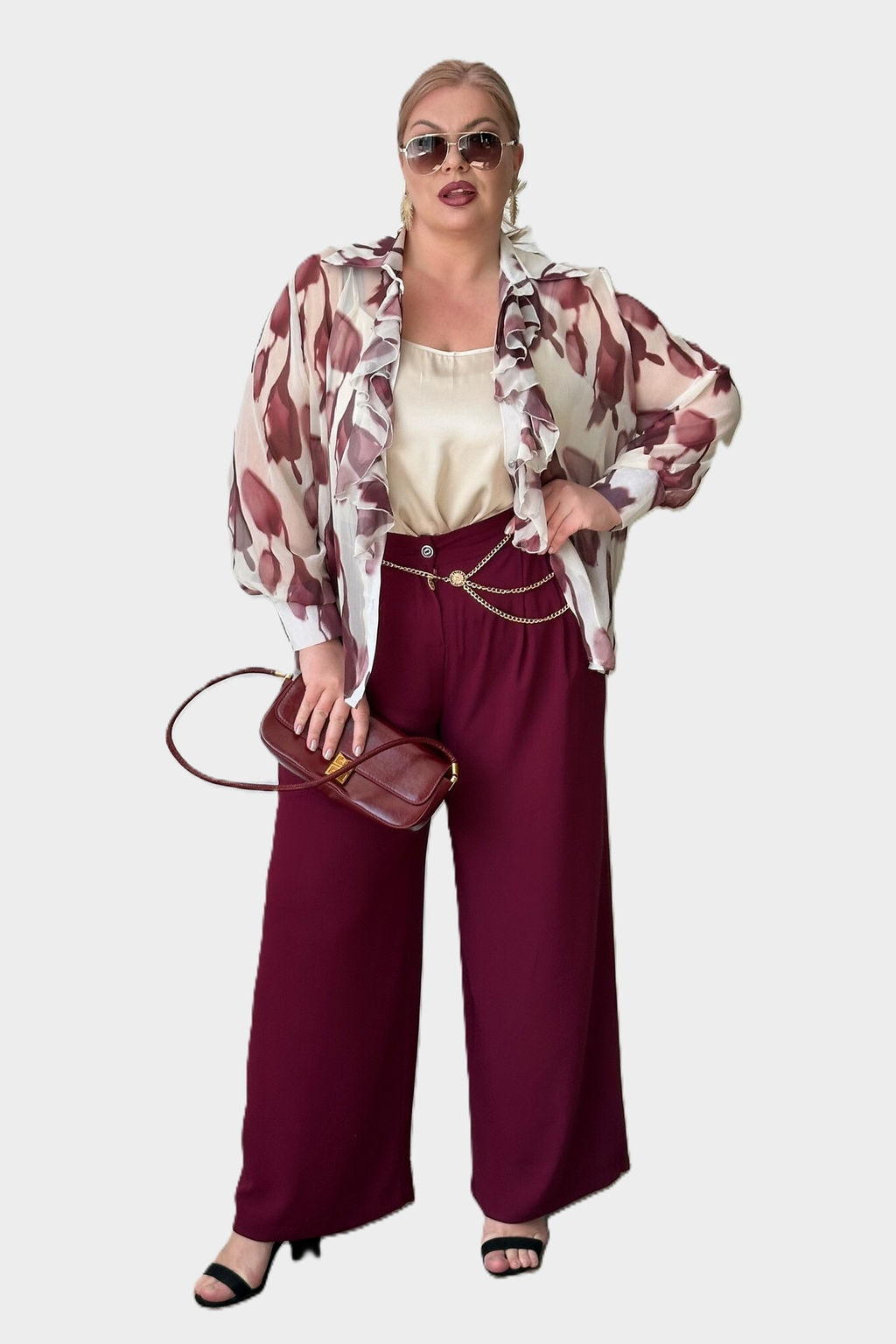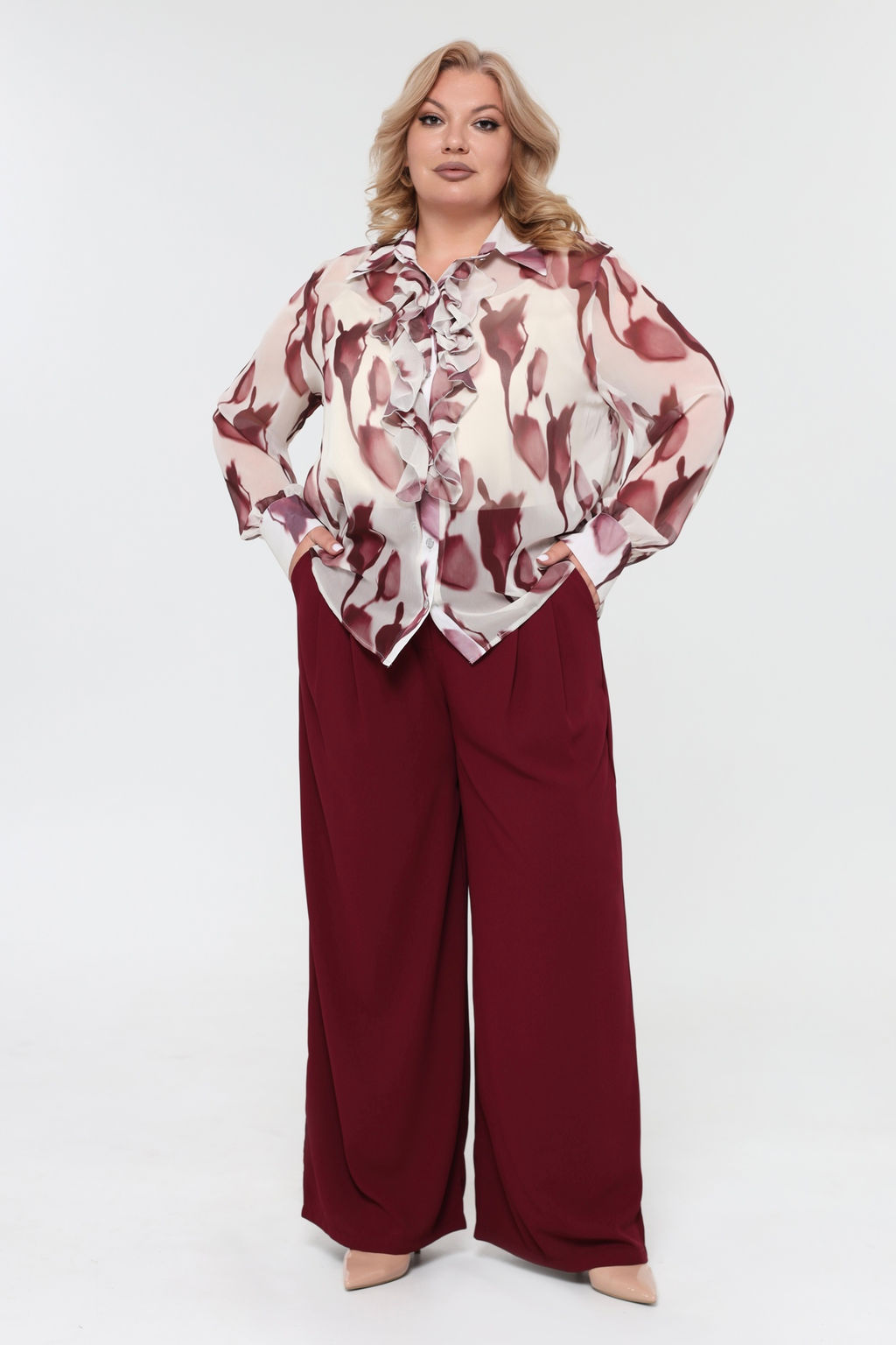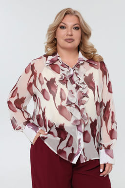 Комплект состоит из рубашки и топа.  Рубашка прямого кроя выполнена из мягкого шифона. Модель привлекает внимание оригинальным дизайном. Рубашка застегивается спереди по всей длине на пуговицы под планку. Имеет классический отложной воротник и рукава полной длины на широких манжетах по низу. Кокетливый волан по планке добавляет модели женственности, а растительный принт - динамичности.