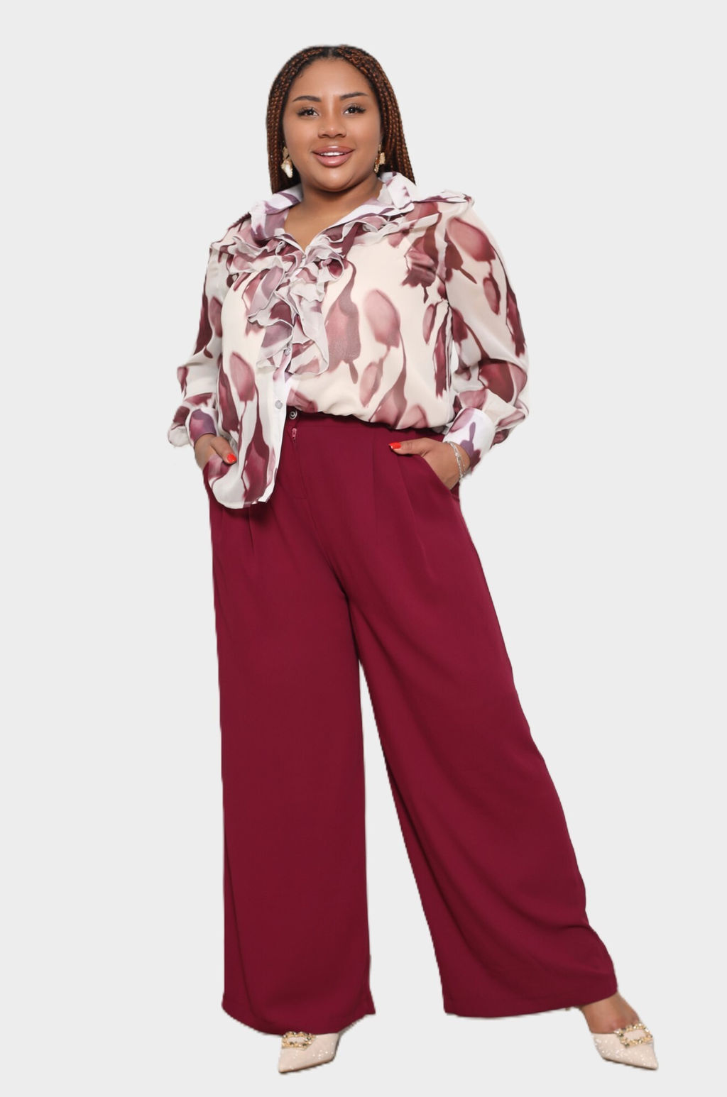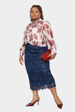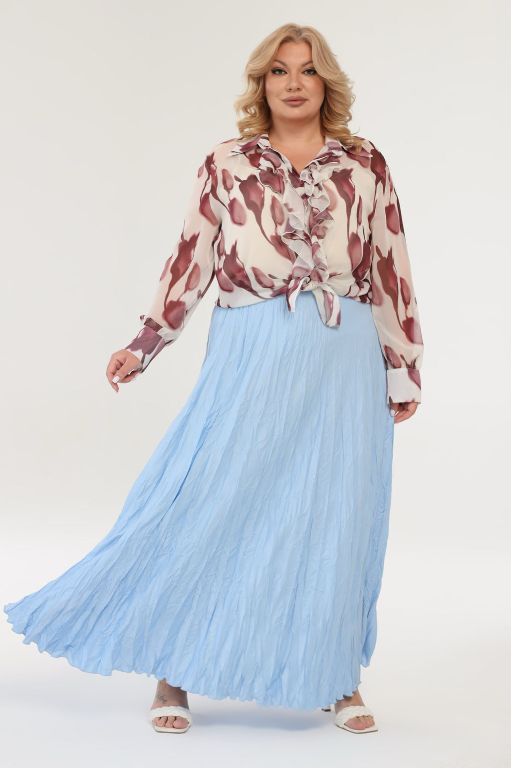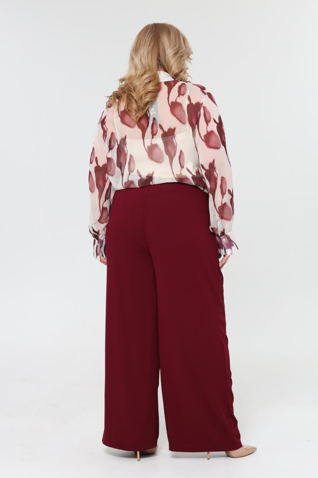 Комплект состоит из рубашки и топа.  Рубашка прямого кроя выполнена из мягкого шифона. Модель привлекает внимание оригинальным дизайном. Рубашка застегивается спереди по всей длине на пуговицы под планку. Имеет классический отложной воротник и рукава полной длины на широких манжетах по низу. Кокетливый волан по планке добавляет модели женственности, а растительный принт - динамичности.