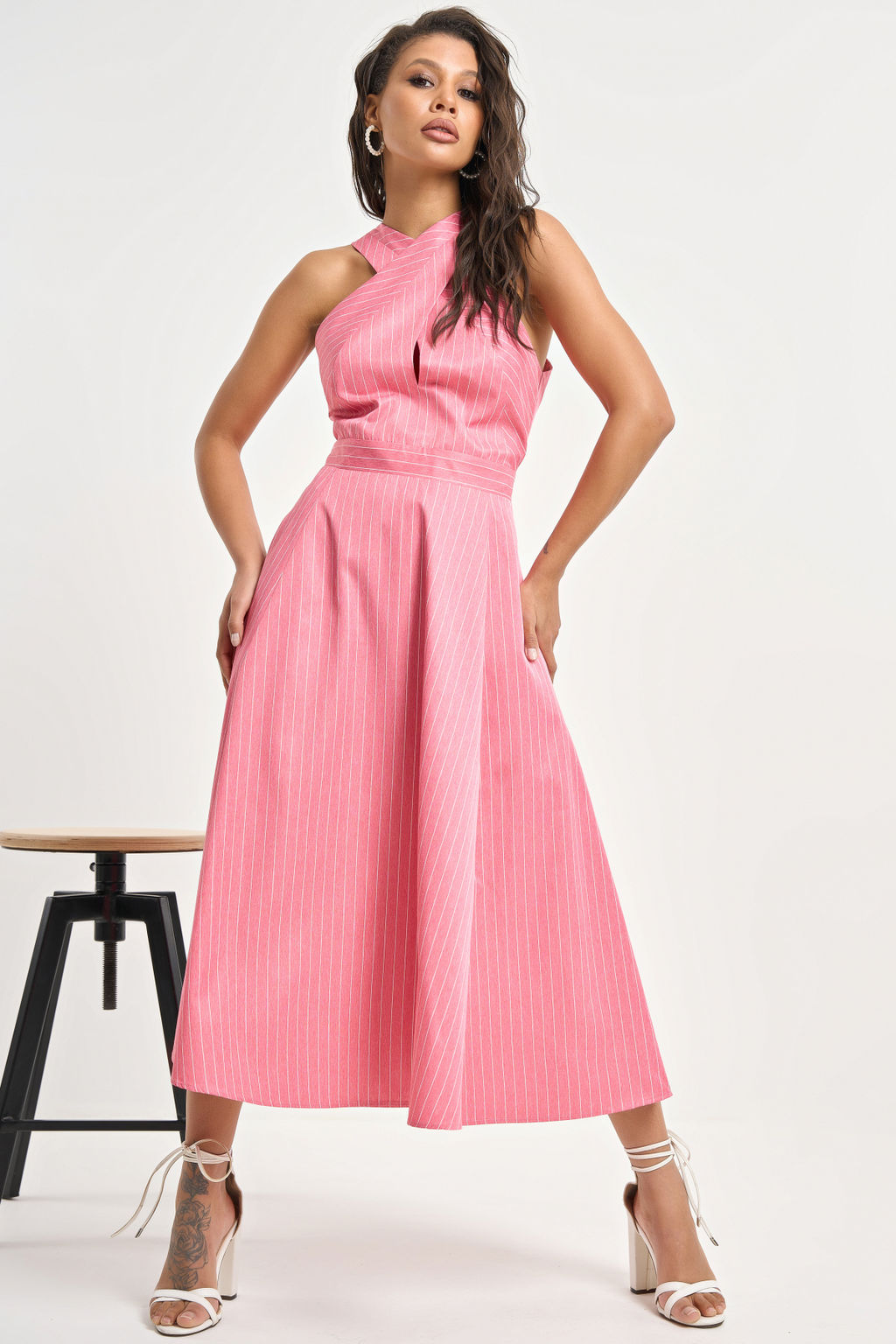 Особенности: Сарафан полуприлегающего силуэта . Лиф переда двойной перекрещен  через шею,  пояс на спинке притачной, спереди отлетной застегивается на пришивную кнопку, в боковых швах карманы. Застежка на молнию в среднем шве спинки.