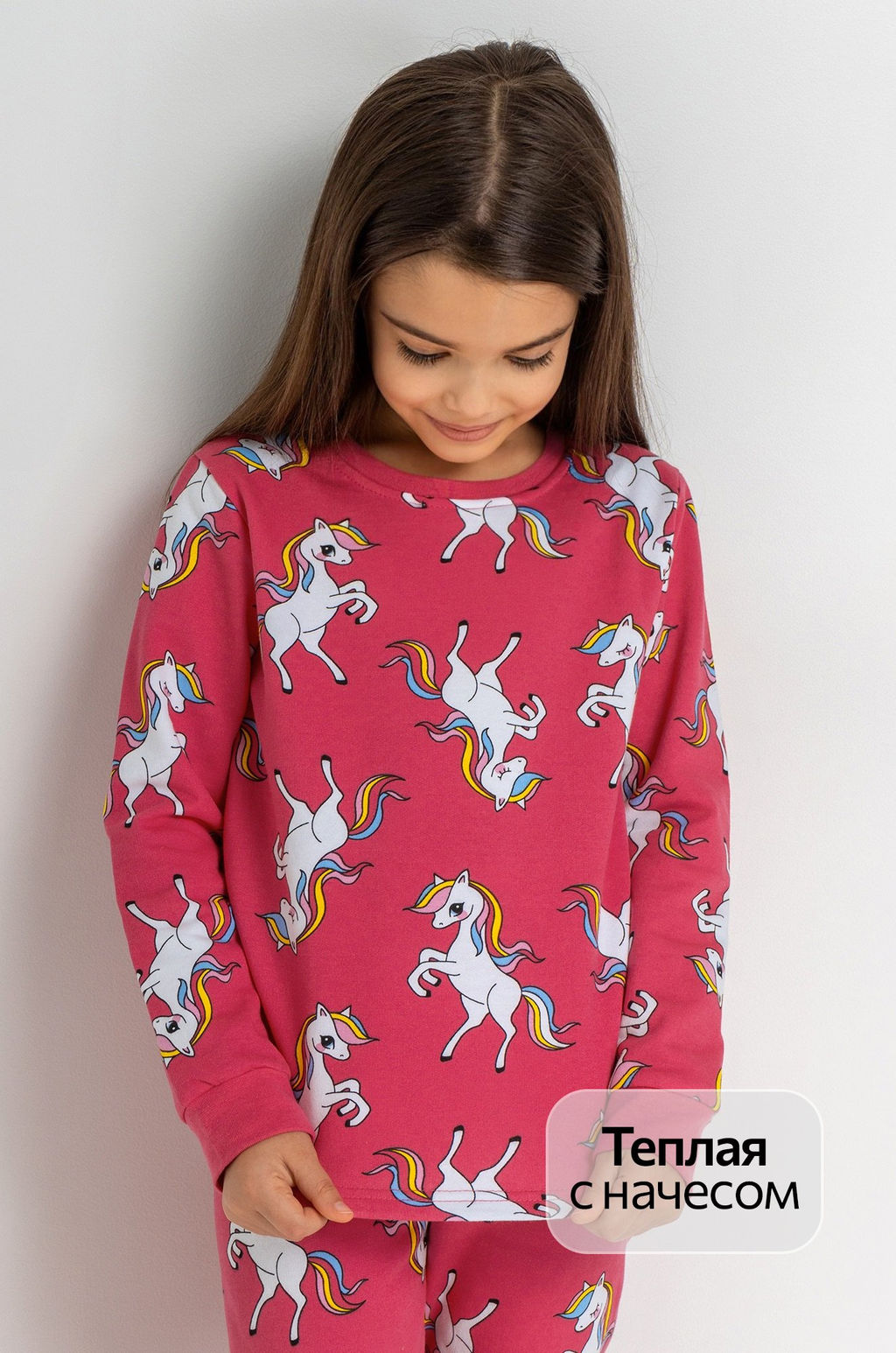 Детская теплая пижама с брюками для девочек выполнена из футера с начесом. Пижама для детей станет любимым атрибутом отдыха юной принцессы благодаря свободному крою и яркому цвету фуксия. Милый принт Единорог поднимает настроение и создает уютную атмосферу.