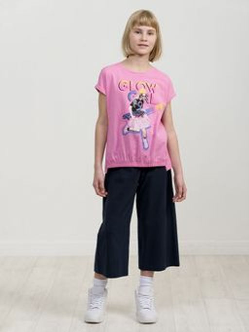 Комплект для девочек футболка и кюлоты. Футболка актуального расслабленного силуэта со спущенной линией плеча. Боковые швы переведены на перед, небольшой перепад длин низа изделия. Передняя часть внизу декорирована манжетой из основной ткани с резинкой. Принт в ярких неоновых цветах с градиентом и элементами граффити. Перевод. Сияющая девушка. Брюки кюлоты актуального свободного кроя с имитацией гульфика. Пояс из основной ткани и дополнительной регулировкой шнурком.