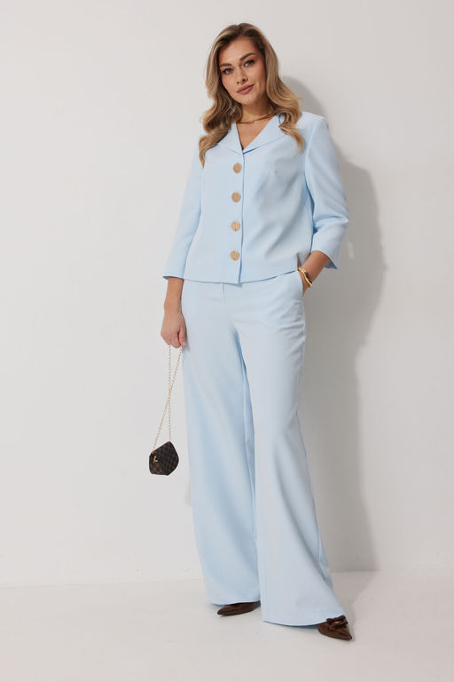 Костюм женский, состоящий из жакета и брюк. Жакет на подкладке, с рукавом и центральной однобортной застежкой на петли и декоративные пуговицы. Длина жакета до линии бедра. По переду обработаны наклонные вытачки. Спинка со средним швом.  Горловина V-образной формы с отворачивающимися лацканами. Линия горловины обработана обтачкой. Рукав втачной, двухшовный ? длины. Брюки женские, прямого силуэта. По переду обработана застежка на молнию. Карманы наклонные с отрезным бочком. На задних половинках брюк застрочены вытачки. Верх обработан широким притачным поясом (частично на резинке), застегивающимся на петлю и пуговицу.