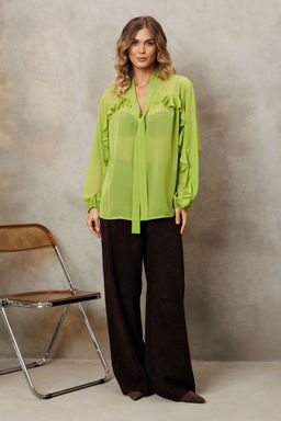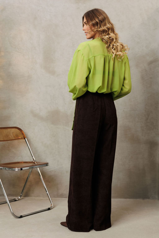 Костюм состоит из блузки и брюк. Блузка свободного силуэта из струящейся шифоновой ткани. Перед и спинка с кокеткой и сборкой. Рукав спущенный свободный с резинкой понизу. Вдоль линии кокетки и рукава вставлена рюша. Горловина V-образной формы с воротником стойкой переходящей в бант.  Брюки палаццо с притачным поясом из мягкой вельветовой ткани. Спереди застежка гульфик на молнии и петлей и пуговицей по поясу. По задней частям брюк вытачки. Пояс с резинкой в боковых частях. Брюки с заутюженными стрелками. Длина блузки - 67см, длина рукава - 60 см. Длина брюк с учетом пояса - 109 см.­