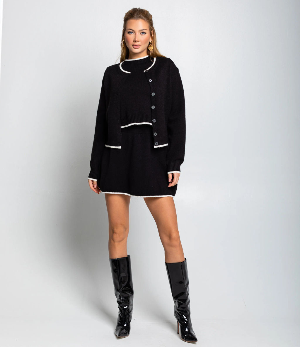 Костюм это одежда, которая подчеркивает стиль и комфорт каждой женщины. Фасон прямой, слегка укороченный по длине и доходящий примерно до линии талии при стандартной посадке, с умеренно свободным силуэтом, сохраняющим форму без выраженной приталенности; горловина круглая, оформлена узкой планкой в резинку, шов горловины аккуратно обработан. Плечи в стандартной позиции, рукава втачные, длинные, с небольшим объёмом в верхней части и мягким сужением к запястью, завершены эластичными манжетами. Передняя часть ровная, без карманов, с декоративной планкой застёжки на пуговицах по всей длине, пуговицы расположены с правой стороны по линии пришива; низ изделия отделан широкой полосой в резинку, создающей лёгкую сборку на талии. Для изготовления использованы ткани 50% хлопок и 50% акрил, который характеризуются отличным качеством и дышащими свойствами. Даже после множества стирок изделие не утратит первоначальной красоты. Вы будете носить его с радостью. Обратите внимание на цвет. Он полностью соответствуют фотографии на сайте. Чтобы вы были уверены в размере, мы представили на странице таблицу. Воспользовавшись ею, вы сможете сами обмерить себя и удостовериться. Установленная нами цена является приемлемой. Не откажите себе в удовольствии быть стильной и комфортной! -- Характеристики -- Цвет: черный Пол: Женский Страна производитель: Китай Сезон: Осень Материал: Хлопок, Акрил