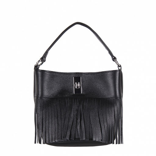 Миниатюрная сумка, выполнена из натуральной кожи. Декорирована бахромой. Дополнена серебристой фурнитурой. Данная модель закрывается на вертушку. Каркас полужесткий. Носится в руке или на плече. В комплекте имеется ремень с регулировкой длины и съёмная короткая ручка.