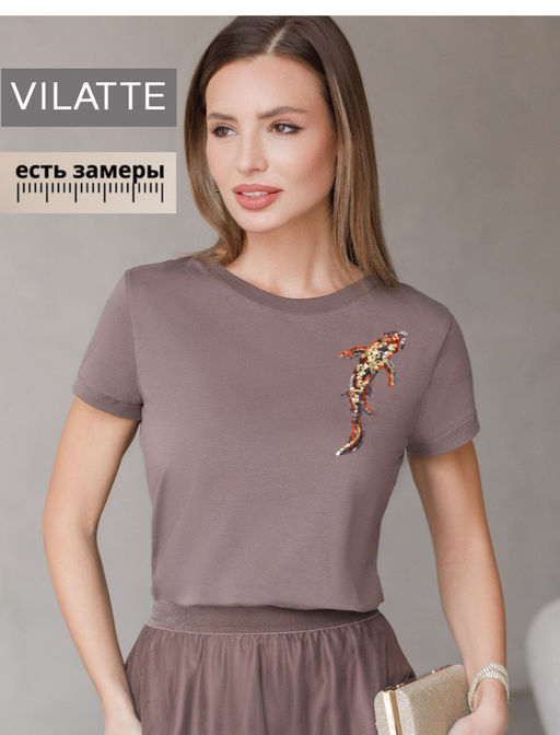 Футболка кофейного цвета идеально подходит для вечеринки и создания яркого образа. Оригинальный принт из пайеток в виде рыбки придает изделию шикарный вид, который привлечет внимание на любом мероприятии. Модель с круглым вырезом и классическим коротким рукавом обеспечивает свободу движений и комфорт в носке. Такой фасон изделия подходит на большие размеры, гармонично сидит на фигуре и помогает создать легкий акцент на достоинствах. Аккуратный круглый вырез красиво подчеркивает шею и делает образ элегантным, сохраняя актуальность для разных случаев от рабочих встреч до вечерних прогулок и праздничных мероприятий.
