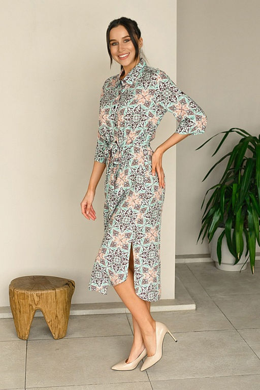 Туника выполнена из яркой принтованной вискозы. Модель на поясе прямого силуэта длины миди. Туника рубашечного типа с воротником стойкой и планкой застежкой на пуговицах. Рукав прямой длиной 3/4­