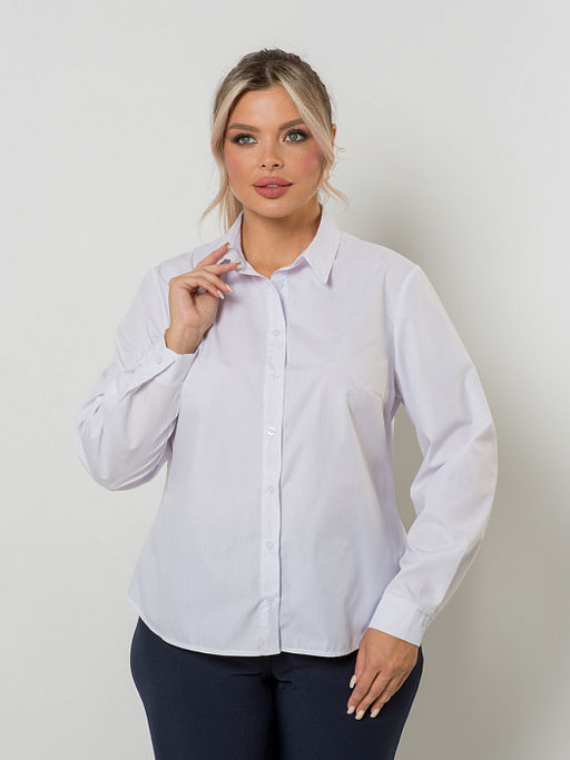 Удобная повседневная блузка, полуприлегающего силуэта, выполнена из сорочечной ткани. Блузка с отложным воротником с отрезной стойкой и центральной застежкой на петли и пуговицы по переду. Спинка целая с двумя вертикальными вытачками. Рукав втачной длинный с притачным манжетом с застежкой на петлю и пуговицу. Длина рукава от плеча в 48 р-ре 58 см. в 64 р-ре 64 см., ширина рукава по низу в 48 р-ре 20 см. в 64 р-ре 26 см. Низ блузки фигурный. Блузка без подклада. Длина изделия по спинке в 48 р-ре 61 см. в 64 р-ре 69 см.