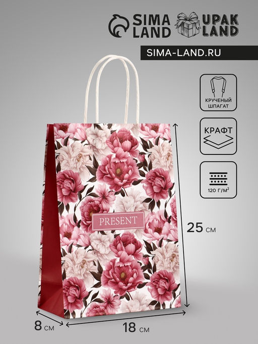 • Цена за 3 шт. Пакет подарочный крафт Цветы, 18?8?25 см