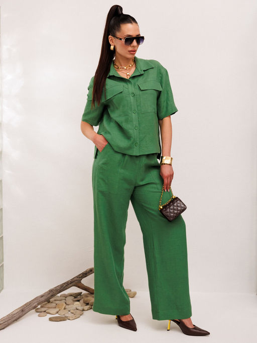 Льняной костюм двойка отличный выбор для женщин которые ценят комфорт и стиль.Этот  комплект состоит из рубашки и брюк, идеально подходит для жарких дней. Рубашка прямого силуэта с воротником стойкой и застёжкой на петли и пуговицы. По переду имеются накладные карманы.