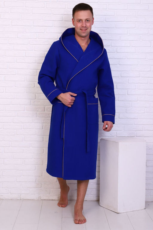 Вафельный халат с капюшоном. Рукав длинный. Накладные карманы. Размерный ряд от 44/46 до 64/66. Плотность вафельного полотна 242 гр. При первой стирке изделие дает небольшую усадку, это нужно учесть при выборе размера! Рекомендация по уходу и эксплуатации за изделием - бережная ручная стирка при температуре не более 30 С, без отжима! Для безупречного разглаживания складок и заломов изделие должно быть влажным.