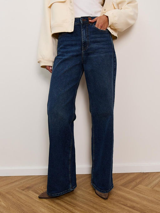 Женские модные джинсы с пятью карманами. Посадка Baggy fit , высокая талия спереди и сзади, широкие штанины  по всей длине. Для  лучшего облегания в области бедер под передними карманами сделана вытачка. Застежка на молнии. Выполнены из слабоэластичной ткани denim comfort stretch. Средня стирка "stone wash".
