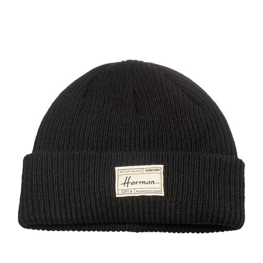 Черная шапка с отворотом. Модель EDMOND 057 связана узором резинка из акриловой пряжи. Спереди головной убор украшает небольшая трикотажная нашивка с логотипом бренда HERMAN. Сшита в Польше.