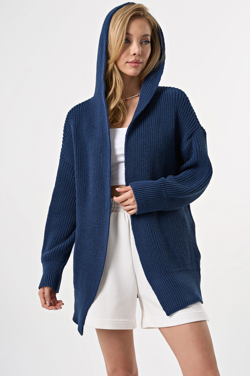 Особенности:  Вязаный фактурный кардиган с капюшоном. Низ изделия и рукавов выполнены широкой резинкой в рубчик.