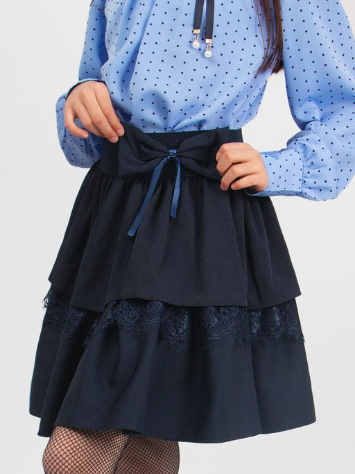 Юбка для девочки Соль&Перец из двухъярусных воланов, декорированная кружевом. Пояс широкий, достаточно эластичный, украшен бантом.