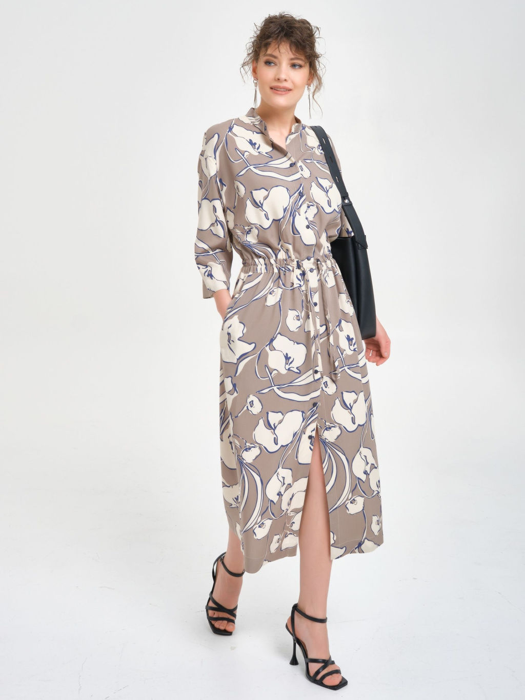 Спереди планка с застёжкой на кнопки. Спинка с кокеткой. Воротник стойка. Плечо спущенное. Рукав длиной 3/4. Талия подчёркнута кулисой, в которую вставлен шнур из основной ткани с резиной и фиксаторами. В боковых швах карманы.­