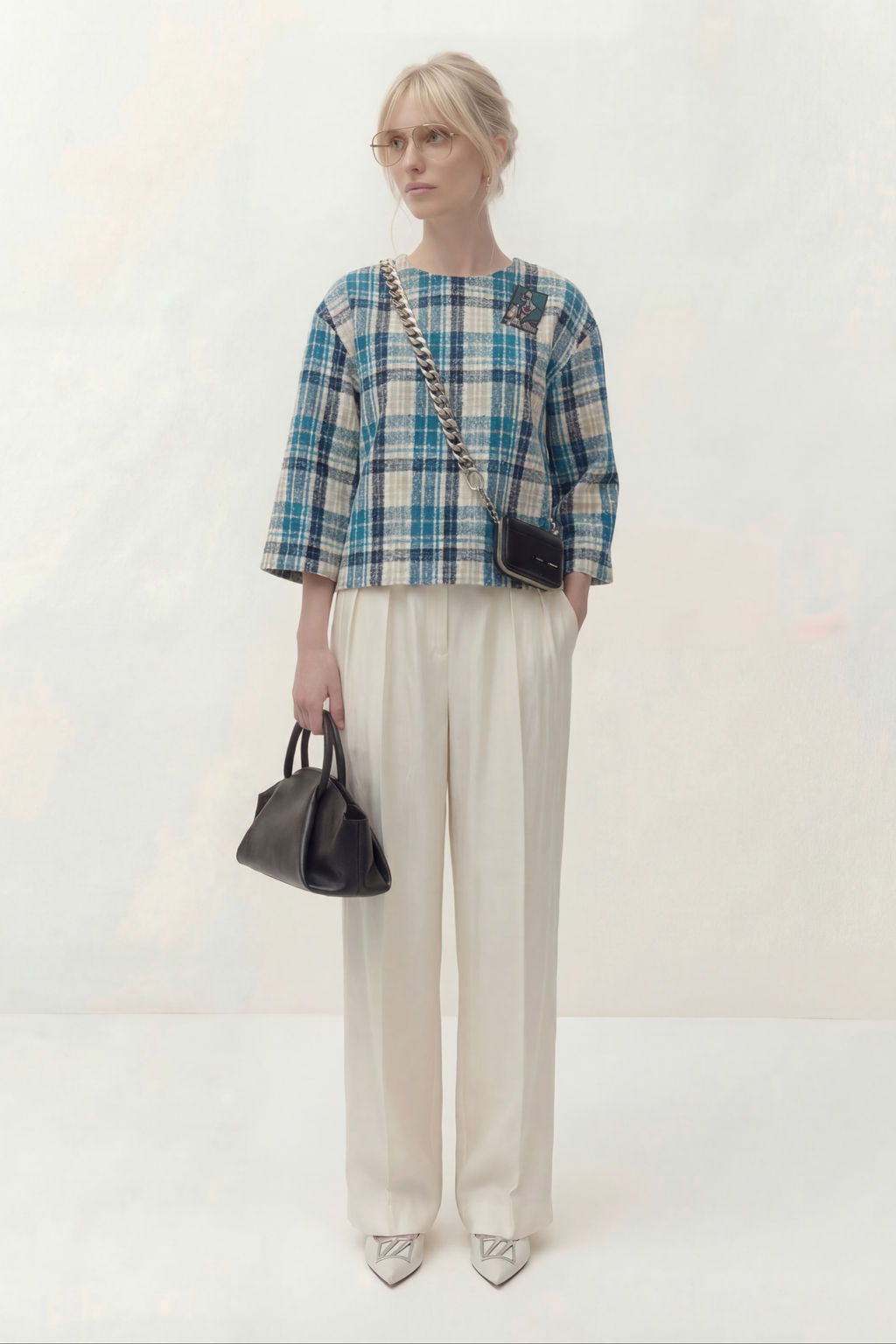 Топ полиэстер 56%, вискоза 35%, шерсть 9%, брюки вискоза 46%, полиамид 40%, полиэстер 14%. Жакет