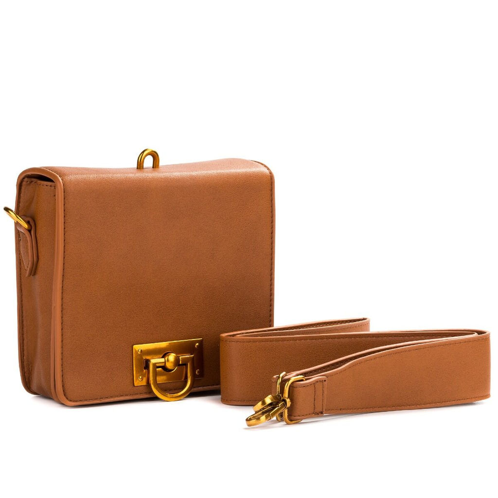 Стильная женская сумка с петлей на запястье выполнена из экокожи коричневого цвета и имеет фурнитуру, стилизованную под винтажное золото. Одно общее отделение закрывается на поворотный замок, выполняющий также декоративную функцию. В комплекте с сумкой поставляются: 1 ремень-петля на запястье, 1 наплечный ремень. Размер: 16*18*7 см.