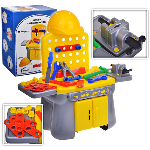 • Комплектация: стол, уровень, ножовка, топор, молоток, ключ гаечный 2шт, плоскогубцы, напильник, болт 6шт, гайка 6шт, пластина 6шт., уголок, каска, тиски.
