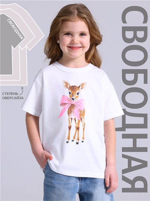 футболка,хлопок 100%,кулир / хлопок 100%,белый / - / Олененок / - / - / -,Футболка для девочки из кулира - легкого хлопкового полотна. Изделие с короткими рукавами со спущенным плечом, украшено печатью. Уход: только машинная стирка (руками не стирать!) при температуре 40 градусов, без предварительного замачивания. Изделия с печатью и декором перед стиркой необходимо вывернуть на изнаночную сторону.