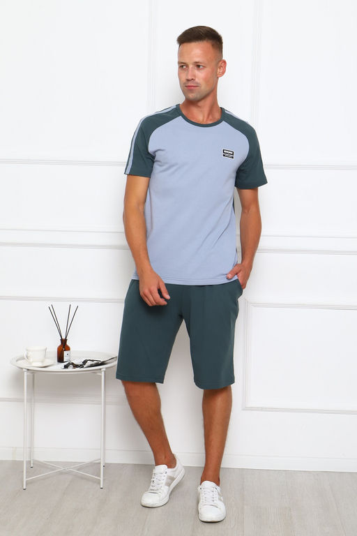Костюм мужской: комфортные шорты с боковыми карманами, футболка с рукавом кроя реглан, по реглану - стильные контрастные лампасы, лаконичный принт на полочке футболки.