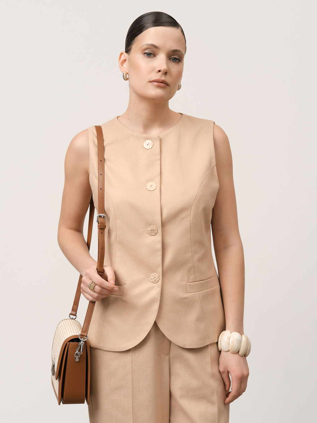 Элегантный жилет из натурального льна с благородным золотистым оттенком. Идеальный акцент для создания стильных многослойных образов в любое время года.