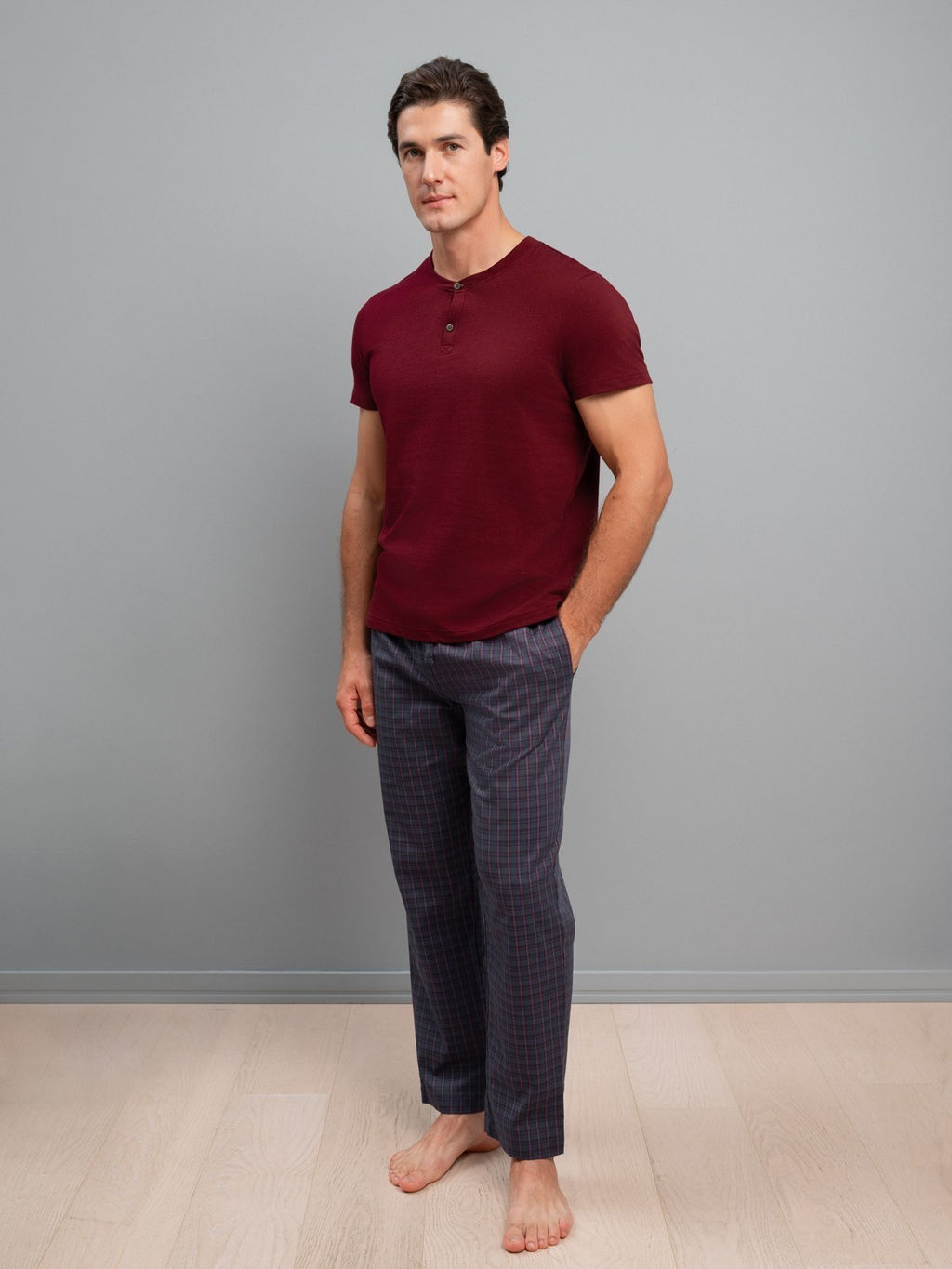 Мужская пижама из натурального хлопка комфортная и приятная в носке. Свободный крой футболки обеспечивает свободу движений и легкость. Брюки в клетку с карманами по бокам дополнены мягкой резинкой и регулируемым поясом, позволяющим добиться оптимальной посадки на талии. Пижама для уютного отдыха и спокойного сна., 100% Хлопок