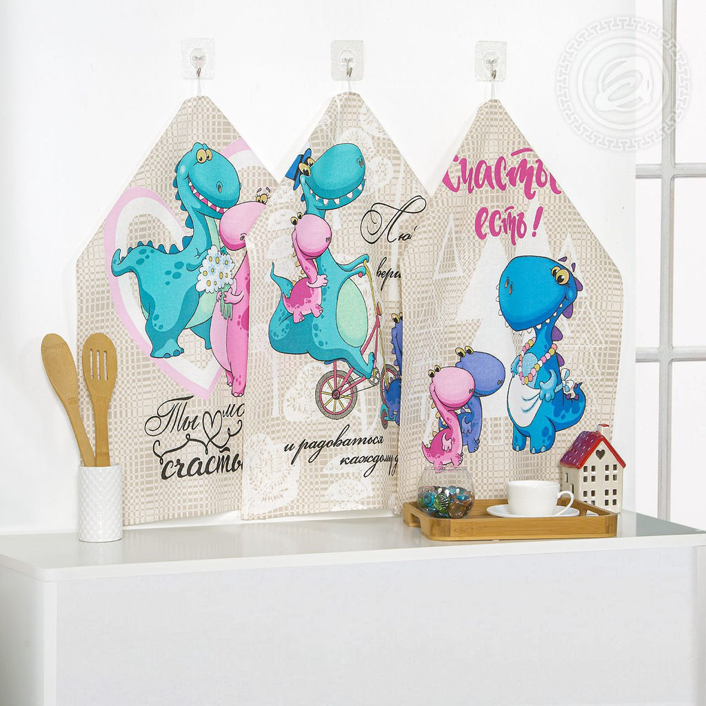 Счастье есть, главный девиз нашего дизайна. Полотенца из рогожки украшены милыми и забавными рисунками с главными героями драконами. Перед нами милые персонажи в свои самые счастливые моменты жизни. Здесь и романтичная свадьба, и подготовка семейного ужина, и прогулка с любимыми малышами. Каждая сценка оригинальна и обаятельна.