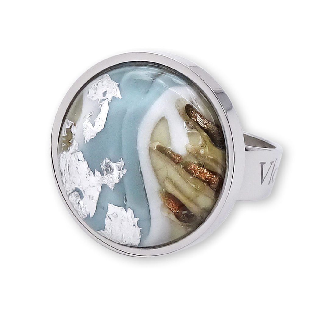 Кольцо изготовлено из муранского стекла и гипоаллергенной ювелирной стали, что очень важно для людей с чувствительной кожей. Металл не темнеет и не подвергается воздействиям окружающей среды, надолго обеспечивая красивый внешний вид изделия. Диаметр стеклянного элемента - 2 см. Кольцо безразмерное, регулируется с 16 до 19 размера. Вес - 8 гр.