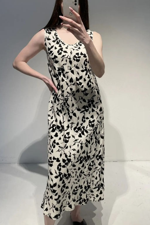 Платье из вискозной ткани прилегающего силуэта. Крой платья - по косой. Круглый вырез горловины и линии проймы окантованы косыми бейками из основной ткани.