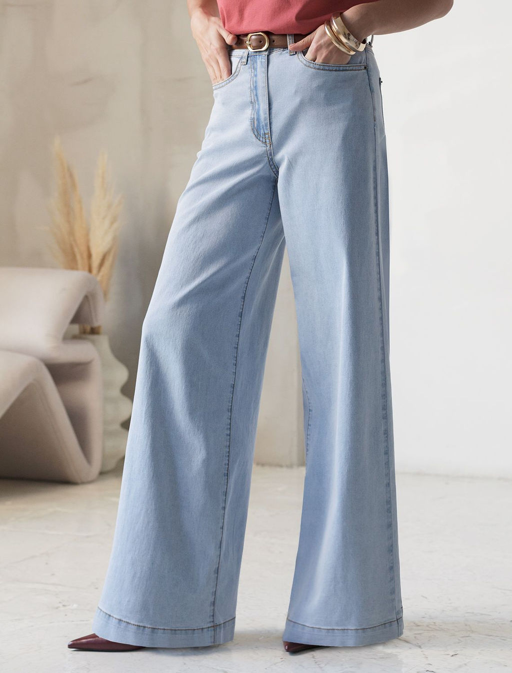 Широкие джинсы светло-голубого цвета выполенены из облегченного денима плотностью 8 OZ, они идеально подходят для весны и лета. После пошива изделие подвергли специальному виду вошинга salt-stone washing (солт-стоун вошинг), что дословно значит стирка с каменной солью. Такой вид вошинга позволяет получить стильные потертости на голубых оттенках денима. Свободные джинсы идеально подойдут для девушек и женщин размера plus size (плюс сайз) с широкими бедрами, скроют недостатки и подчеркнут достоинства фигуры, Высокая посадка и прямой крой визуально вытягивают силуэт. Качественная надежная фурнитура делает добавлет образу премиальности. Широкие легкие джинсы не стесняют движений, позволяя чувствовать себя комфортно даже в жаркую погоду. Базовые летние джинсы не только удобные, но и практичные для повседневной носки, благодаря натуральному материалу и продуманному крою. Джинсы трубы всегда актуальны и незаменимыми для базового гардероба.