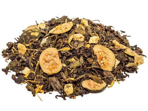 Бленд крупнолистового зеленого китайского чая, кусочков гуавы, яблока и лепестков солнечной календулы. С ароматом спелой гуавы.