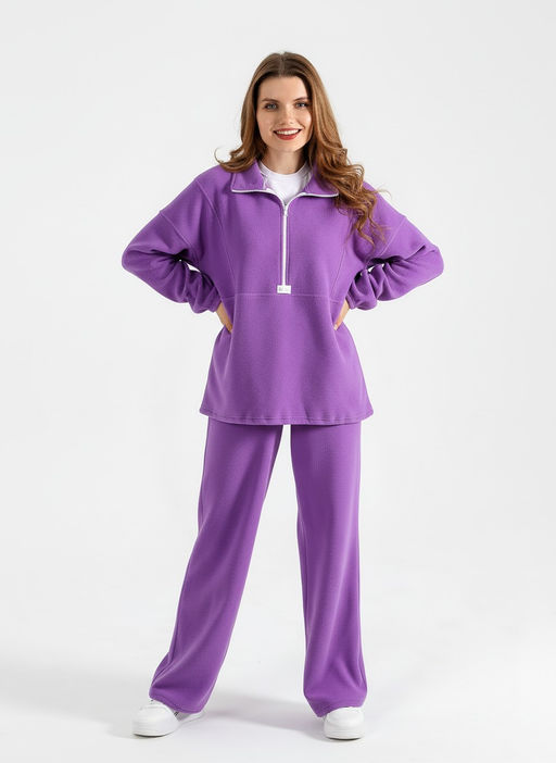 Костюм, состоящий из толстовки и брюк. Толстовка - свободного покроя, средней длины, с длинными рукавами на основе цельнокроеных. Деталь переда - с отрезной кокеткой, состоящей из четырех деталей, симметрично расположенных относительно центрального шва, обработанного с застежкой на тесьму "молния". Спинка - с отрезной кокеткой. Нижние срезы рукавов обработанышвом вподгибку с эластичной тесьмой. Низ изделия обработан швом вподгибку. По всем основным соединительным швам толстовки настрочены отделочные строчки. Брюки - длинные, свободного покроя, на притачном поясе с эластичнойтесьмой внутри и карманами в боковых швах. Нижние срезы обработаны швом вподгибку с эластичной тесьмой. -- Характеристики -- Состав: 100% ПЭ Ткань: Флис Флис - Название флисовой ткани произошло от англ. fleece ворс, шерсть. В отличие от натуральных шерстяных тканей, флис синтетическая ткань, при изготовлении которой используется полиэстер и другие искусственные нити.Однако, как и шерсть, флис обладает способностью хорошо сохранять тепло, а, кроме того, более легок, неприхотлив, и обладает влагоотталкивающими свойствами.! Ист. справка - флисовая ткань впервые была получена в конце 20 в. Открытие было удостоено Нобелевской премии, и не зря- материал оказался достойной заменой шерсти достаточно теплый, но в то же время, позволяющий телу дышать.