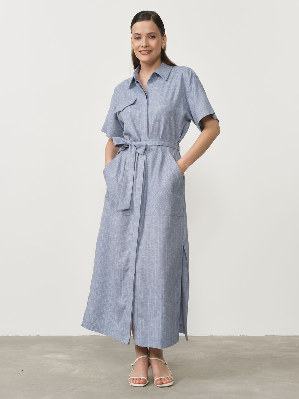 Лаконичный крой с чистыми линиями создает утонченный и женственный силуэт, подчеркивая достоинства фигуры. Платье имеет продуманные пропорции и свободную посадку, обеспечивающую свободу движений и непринужденную элегантность. Насыщенный синий цвет придает модели особую глубину и выразительность, а также обладает универсальностью, позволяющей легко сочетать платье с различными аксессуарами от соломенных сумок и сандалий для повседневных выходов до изящных туфель и ювелирных украшений для более торжественных случаев.