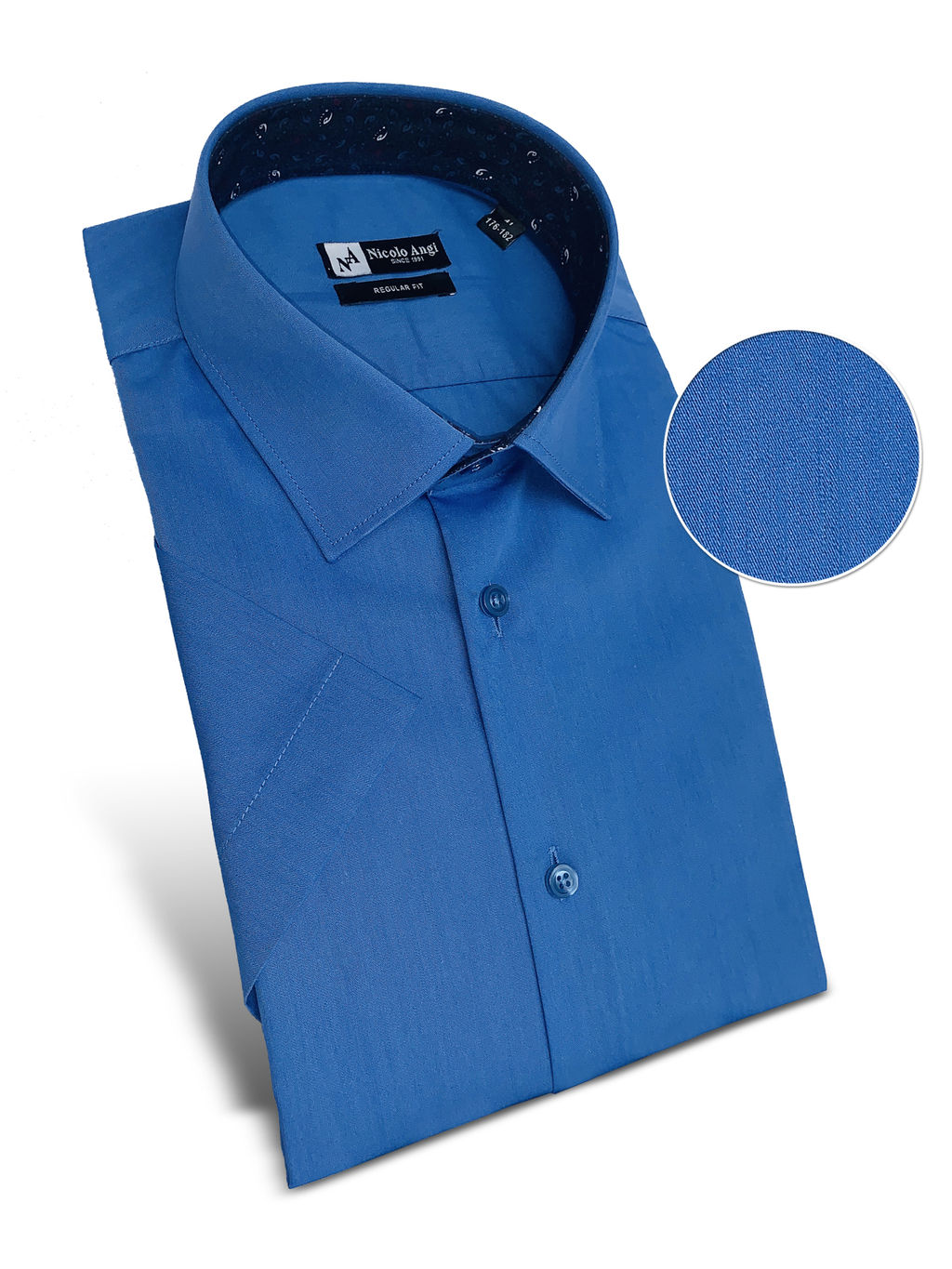 Бренд: Nicolo Angi Длина рукава рубашки: Короткий Карман: Без кармана Силуэт: Полуприталенный силуэт (regular fit) Состав: 80% хлопок, 20% полиэстер Стиль: Деловой Узор (рисунок): Без рисунка (однотонная) Цвет: Синий