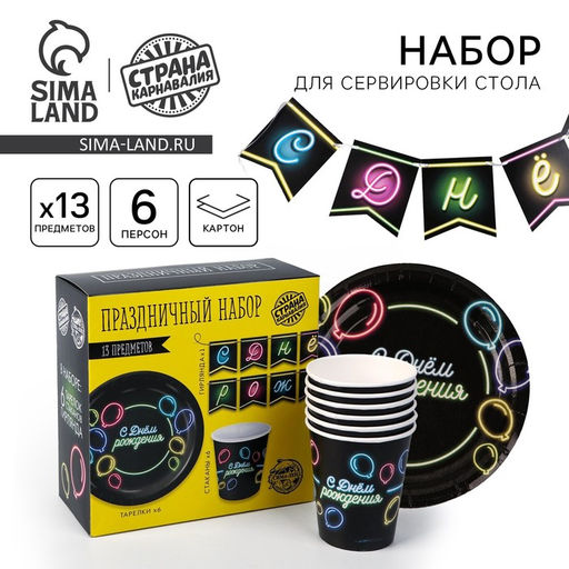 • Посуда одноразовая бумажная «С днём рождения», неон, 6 тарелок, 6 стаканов, 1 гирлянда