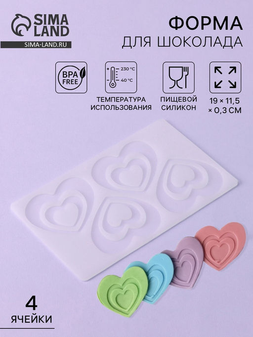 • Цена за 4 шт. Форма для шоколада Сердцем к сердцу, силикон, 4 ячейки, 19?11.5?0.3 см, прозрачная