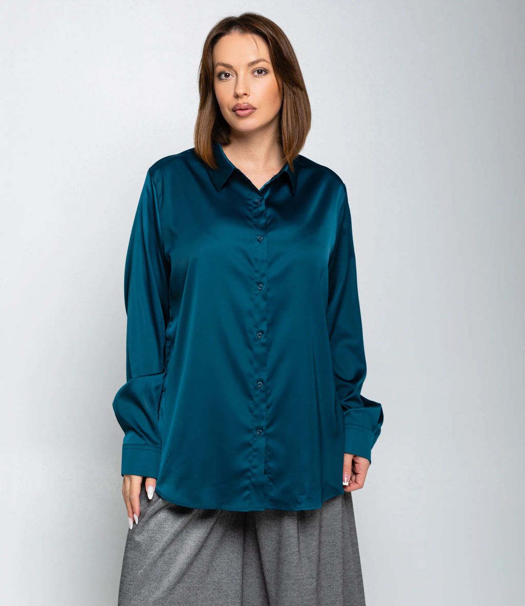 Рубашка это часть гардероба, которая подчёркивает привлекательность и индивидуальность любой женщины. Рубашка прямого свободного кроя, слегка удлинённая, с классическим отложным воротником и центральной планкой на пуговицах; втачные длинные рукава с прямоугольными манжетами на пуговицу, округлённый нижний край с удлинением по спинке и боковыми разрезами для удобства движения, отсутствие нагрудных карманов подчёркивает минималистичную линию; лёгкий гладкий материал средней плотности с мягкой драпировкой и небольшим блеском, аккуратно обработанные швы и скрытая строчка на планке, прочные закрепки в зонах нагрузки, посадка с запасом в области плеч и груди для расслабленного, но аккуратного силуэта, универсальная базовая модель для деловых и повседневных образов. Для пошива использована ткань: 95% полиэстер, 5% спандекс. Мы предлагаем выгодные оптовые условия, гибкую ценовую политику и надёжные поставки для магазинов. Установленная цена адекватна и позволит вам формировать привлекательную наценку и обеспечивать высокую оборотность. Предложите своим покупательницам рубашку, сочетающую комфорт, качество и повседневную элегантность. -- Характеристики -- Цвет: морская волна Пол: Женский Страна производитель: Китай Сезон: Демисезон Материал: Полиэстер, Спандекс
