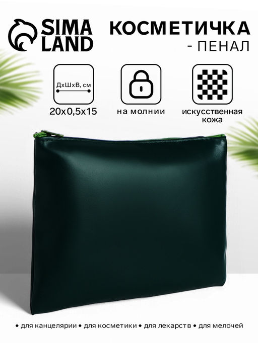 • Косметичка на молнии, плоская, средний размер, однотонная, тёмно-зелёная