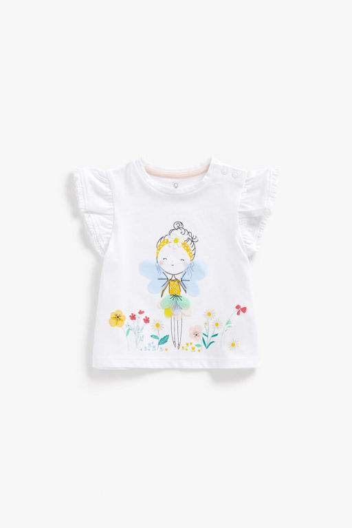 Распродажный ассортимент - это остатки коллекций, выставочные образцы с витрины, товары без упаковки, восстановленные или пользующиеся низким спросом изделия, а также продукция с незначительными дефектами внешнего вида (царапины, потертости и другие особенности). Обращаем ваше внимание, что продукция данной категории возврату и обмену не подлежит. Приобретая товары из распродажного ассортимента вы соглашаетесь на наличие дефектов во внешнем виде или упаковке. - 100% Хлопок_Хлопковая футболка с коротким рукавом в белом цвете для девочки, украшенная рисунком с аппликациями "Цветочная фея". В размерах до 86 включительно предусмотрены безникелевые кнопки на плече.­