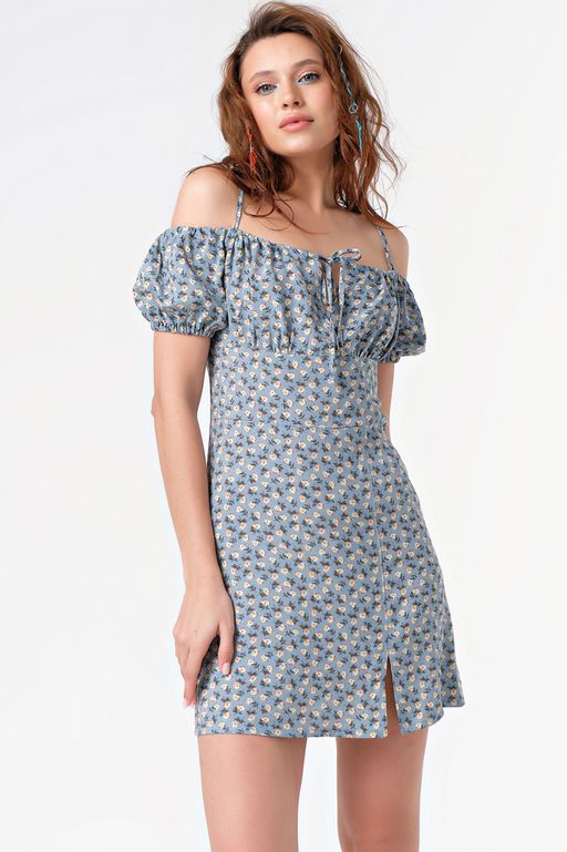 Особенности: Платье прилегающего силуэта из плательной ткани. Детали: отрезной лиф со сборкой на кулиску по линии декольте переда, рукава со сборкой на резину по верху и низу, сборка по линии притачивания верхней части лифа переда, бретели с регуляторами, расклешенная юбка с разрезом по рельефу переда. Застежка на молнию в среднем шве спинки.
