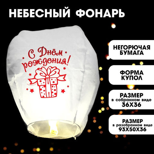Фонарик действует по принципу воздушного шара. Объёмная конструкция сделана из бумаги, пропитанной антигорючей смесью. В нижней части купола на проволоке закреплена свеча-горелка. Она разогревает воздух внутри фонарика, поднимает его вверх и эффектно подсвечивает изнутри, создавая таинственный ореол.Длительность полёта составляет около 20 минут — за это время бумажный фонарик поднимается на высоту до 200 метров.С помощью небесного фонарика вы сможете ярко завершить значимое событие в жизни, любое мероприятие станет запоминающимся с таким праздничным атрибутом. Рисунок: Да. Тематика праздника: День рождения. Форма: Купол. Бесплатная доставка: Да. Наша разработка: Да. Размеры товара: 36/0.5/36.