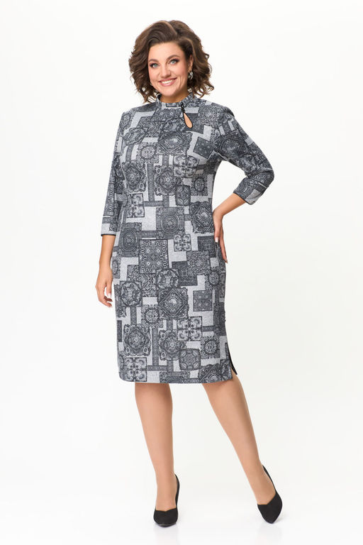 Платье женское прилегающего силуэта с втачным рукавом.  По горловине  воротник стойка  с вырезом  в форме капелька,  с застежкой на воздушные петли и пуговицы. По линии груди и талии вытачки. Спинка со швом посередине с застежкой на потайную тесьму молнию, с вытачками по линии талии. Рукав длиной ? с фигурным разрезом и воздушными петлями и пуговицами. В левом боковом шве разрез с воздушными петлями и пуговицами. Вырез по горловине,  низу рукавов и разрезу по низу платья обработан кантом.