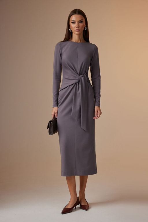 Платье женское, полуприлегающего силуэта. Перед со средним швом и драпировкой в области талии, переходящей в завязывающийся пояс. Горловина округлой формы. Спинка со средним швом, сверху заканчивается разрезом и застежкой на навесную петлю и пуговицу, снизу разрез. Рукав втачной, длинный, зауженный книзу.