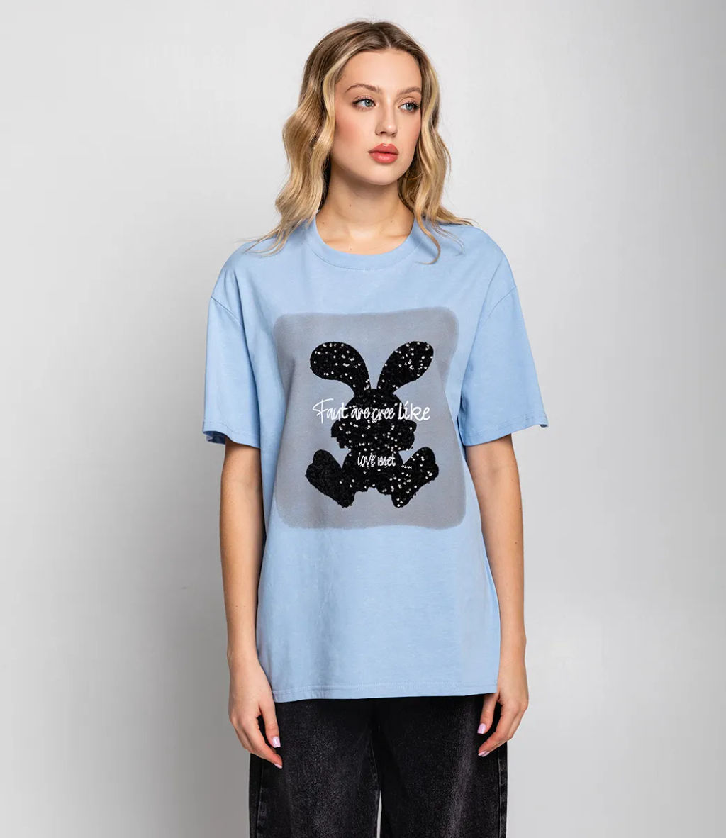 Футболка - это вещь, которая выделяет и подчеркивает уникальность каждой представительницы прекрасного пола. Принт с изображением зайца и надписью, придает футболке яркий и креативный вид. Свободный и стильный крой, который не сковывает движения. Она отлично смотрится как с джинсами, так и с юбками, а также с шортами, что придаёт множество вариантов для создания стильных образов. Ее предпочитают покупательницы, которые ценят сочетание эксклюзивности и доступной цены. Приталенный силуэт и классический крой футболки подчеркивают привлекательность фигуры. Для изготовления выбрана ткань, которая выделяется отличным качеством. Изделие из 95% хлопка и 5% спандекса. Вы будете её носить с большим удовольствием. Обратите внимание на цвет - он является насыщенным и полностью соответствует фотографии на сайте. Чтобы вы не сомневались в размере, мы предоставили на странице таблицу. Воспользовавшись ею, вы сможете сами сделать мерки и убедиться. Установленная нами цена является доступной и адекватной. Подарите себе удовольствие быть элегантной и неповторимой с нашей футболкой! Рост 174 см, 80-58-88.­