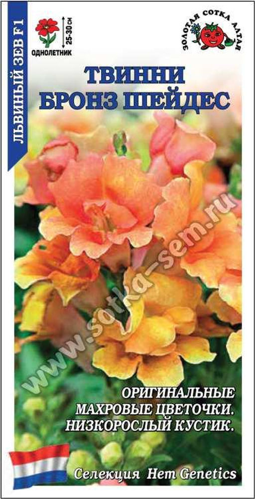 Эффектный гибридный львиный зев серии Твинни. Растение низкорослое, хорошо ветвится от основания, имеет компактную форму и не разваливается, в открытом грунте достигает высоты 25-30 см, при контейнерном выращивании 15-20 см, ширина куста 20-25 см. Оригинальной формы махровые цветочки, собранные в небольшие кисти, выделяются неоднородной золотисто-оранжевой окраской с бронзовыми переливами. Гибриды этой серии отличаются устойчивостью к жаре и дождливой погоде, цветут невероятно обильно на протяжении всего сезона, до первых заморозков. Используются для создания рабаток, аккуратного бордюра и обсадки цветников, прекрасно подходят для выращивания как в горшках диаметром 10-15 см, так и в больших контейнерах.