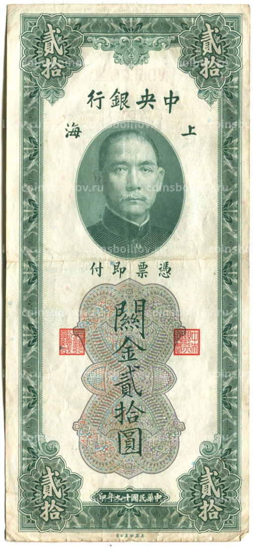 Банкнота 20 золотых таможенных единиц 1930 года Китай