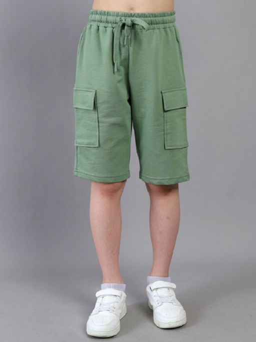 Шорты для мальчика из футера. Верх шорт обработан притачным поясом из основного полотна и эластичной резинкой внутри, в пояс вставлен функциональный шнурок с пластиковым наконечником. На боковых швах расположен накладной карман с клапаном.