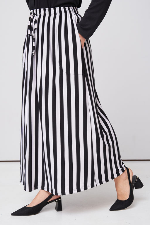 Длинная трикотажная юбка больших размеров в полоску Черно-белая полосатая юбка А-силуэта длиной ниже колена идеально подчеркивает достоинства фигуры и скрывает небольшие несовершенства. Высокая посадка с эластичной лентой и кулиской на завязках по поясу позволяет регулировать комфорт и подчеркивает талию, создавая стройный силуэт. Практичные карманы в боковых швах добавляют удобства, а нежная трикотажная вискоза обеспечивает легкость, дышащие свойства и отличный комфорт в жаркую погоду. Модель специально разработана для полных девушек в размере плюс-сайз, подчеркивая вашу индивидуальность и стиль. Эта юбка сочетание моды и комфорта, которое подойдет для разных случаев от прогулок до офисных будней. Обновите свой гардероб элегантной и универсальной вещью уже сегодня! Размер на модели 52-54 Параметры модели: рост 170, 102/77/110 Как выбрать размер -- Характеристики -- Сезон: Лето Материал: Трикотаж Состав?01) 100% хлопок 02) 95% хлопок, 5% эластан 03) 60% вискоза, 40% хлопок 04) 60% вискоза, 40% хлопок 05) 75% хлопок, 25% полиэстер 06) 50% вискоза, 35% полиэстер, 10% шерсть, 5% эластан 07) 65% полиэстер, 25% вискоза, 10% эластан: 95% вискоза, 5% эластан Цвет: черный, белый Принт: полоска Стиль: Для полных, Повседневный Силуэт: А-силуэт Особенности: большие размеры, для полных, оверсайз Карманы: В шве Длина: Макси Застежка: Кулиска, Резинка Стирка: Деликатный режим, не более 40 градусов Страна производства: Россия В наличии: Да