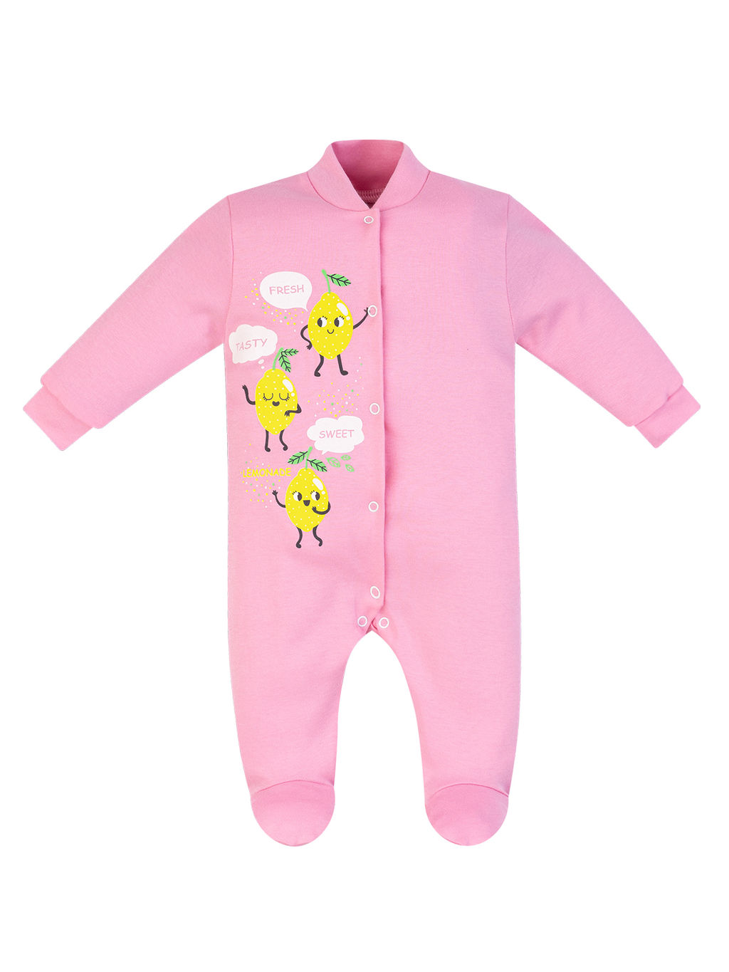 Превосходный трикотажный комбинезон с закрытыми ножками очень удобно использовать в нежаркие деньки. Комбинезончик выполнен из высококачественного хлопкового интерлока розового цвета, весьма нежненького, приятного и мягкого. Открытые длинные рукава оформлены эластичными манжетами, а воротничок-стойка изготовлен из такого же материала. От горловины и до проймы ножек проходит удобная застёжка в виде кнопочек. Спереди принт лимончики и надписи.